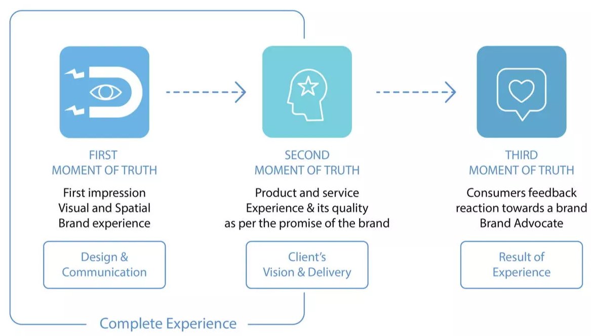 The moment a customer/user interacts with a space, brand, product, or service forms an opinion about it. Changing an impression or opinion about that particular brand, product, or service in marketing is called a moment of truth.