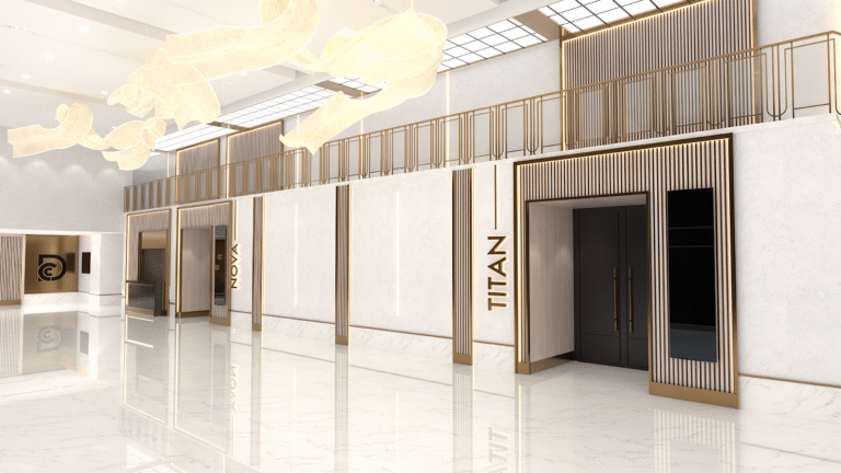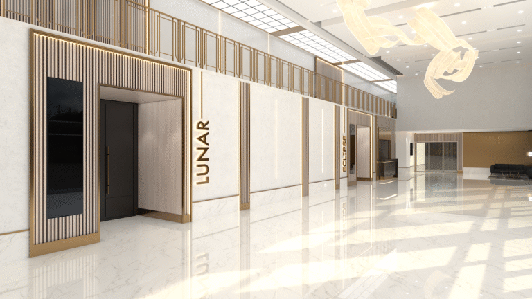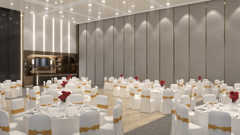Interior design for a versatile event space that blends modern elegance with functional flow, tailored for both grand galas and intimate celebrations.