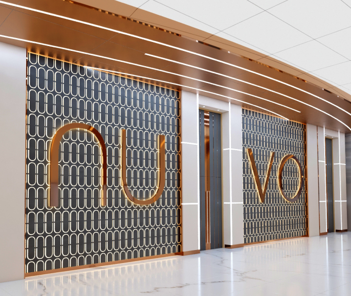 • Large but delicate circular light fixtures provide a sculptural quality to the reception and lounge.