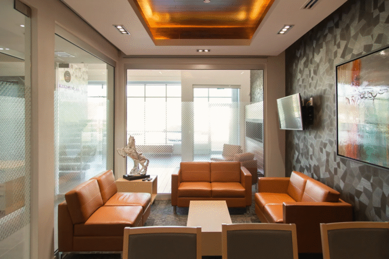 A luxurious, modern office designed within a double-height space, blending natural light, neutral tones, and earthy accents. Featuring a striking silver-finished staircase, glass partitions, sculptural lighting, and high-end furniture, the design creates a sophisticated yet welcoming corporate environment.