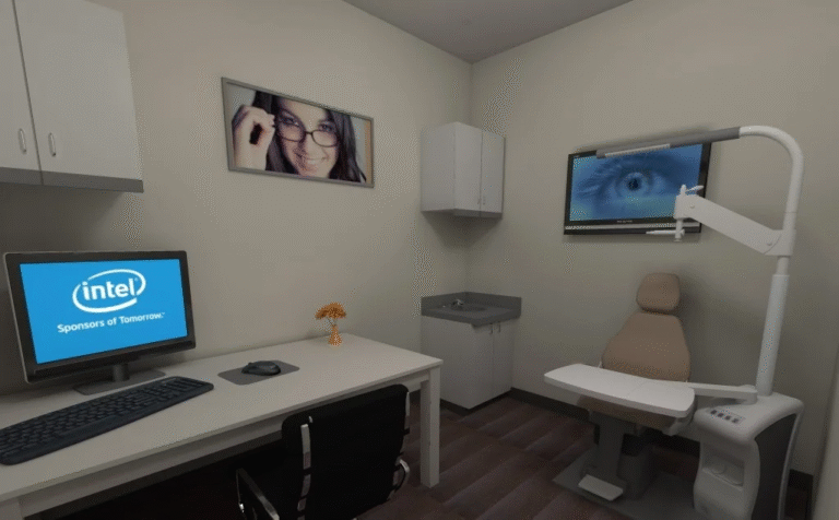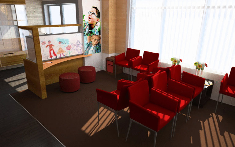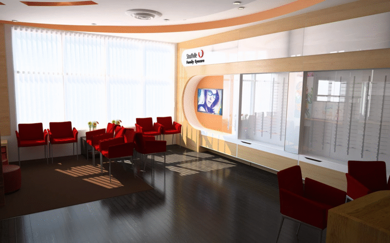 Stouffville Eye Centre is designed to be calm, welcoming, and family friendly. Soft lighting, earthy tones, and a high-ceilinged entrance create a peaceful atmosphere. With a dedicated kids’ area, modern retail display, and functional exam rooms, the space blends comfort and care in every detail.